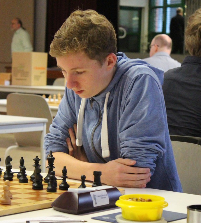Spannender war es im Spiel von Oskar Merle (Rheda) gegen Stephan Peters (Brackwede). Hier lag die Favoritenrolle beim Brackweder. Auf einem total vollen Brett spielte Oskar sehr mutig. Er gab auch einen Bauern, wahrscheinlich eher unfreiwilig, bekam dafür aber einen tollen Angriff auf den rochierten König. Stephan musste einen Turm für eine Leichtfigur opfern. Oskar tauschte vielleicht zu viel und Stephan bekam mit seinem Läuferpaar Gegenspiel. Dann wurde Oskar vielleicht etwas ungenau, und Stephan konnte sich im Bauernendspiel mit ungleichfarbigen Läufern durchsetzen. Seine Bauernstruktur war einfach viel besser und sein Läufer stand auch besser. Das Finale heißt nun Stephan Peters gegen Thomas Bergmann.