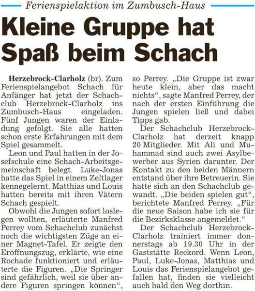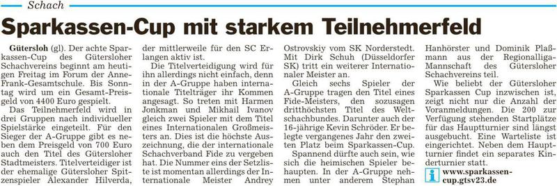 Heute wurden im Kreis Gütersloh in der "Glocke" gleich zwei schöne Artikel zum Thema Schach veröffentlicht. Fast schon "normal" ein größerer Hinweis auf den Gütersloher Sparkassen-Cup. Und zum anderen ein interessanter Artikel über das Angebot der Schachfreunde aus Herzebrock-Clarholz im Rahmen der dortigen Ferienspiele. Beides schöne Werbung :-)