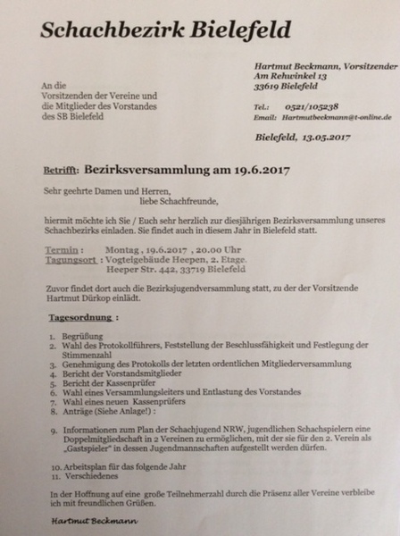Es sei daran erinnert, dass bis zum 01. August 2016 die Mannschaften auf der Bezirksebene, von der Bezirksliga bis zur Kreisklasse gemeldet werden müssen. Entweder direkt beim Schachbund NRW im Vereinsportal, oder per Formular beim Spielleiter, Andreas Schneider.