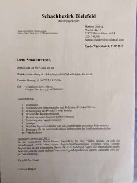 Rüdiger Mönig informiert, dass auf der Seite der Schachjugend OWL die Terminpläne, und Ansetzungen der U12, U14 und U16 veröffentlicht wurden. Hier ist der direkte Link dahin. Bis zum 01. August müssen, sofern noch nicht geschehen, die Mannschaftsaufstellungen gemeldet werden.